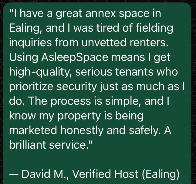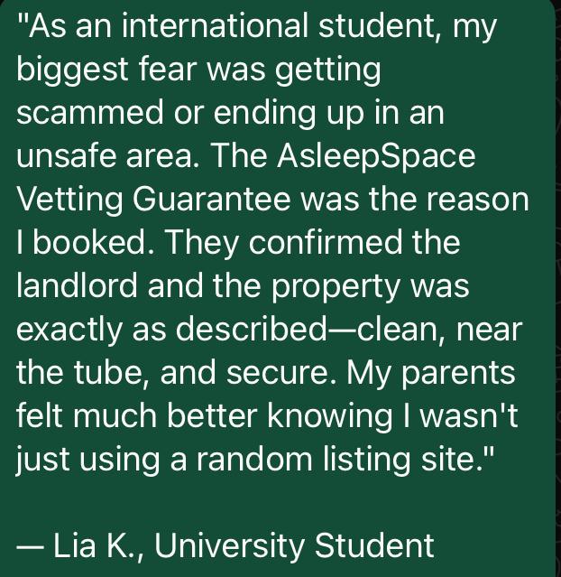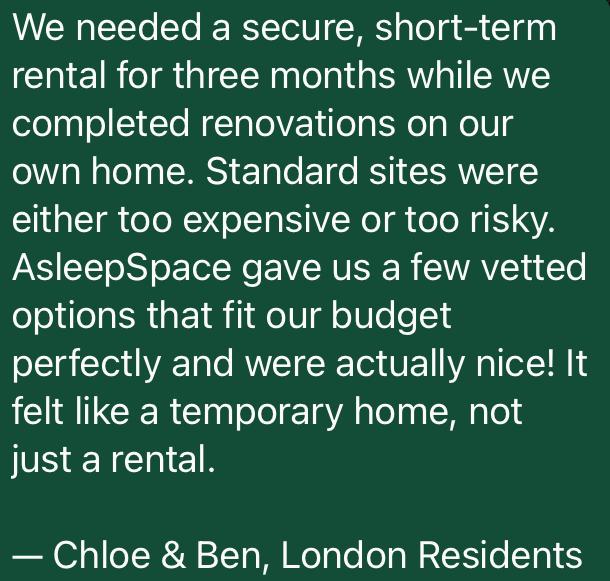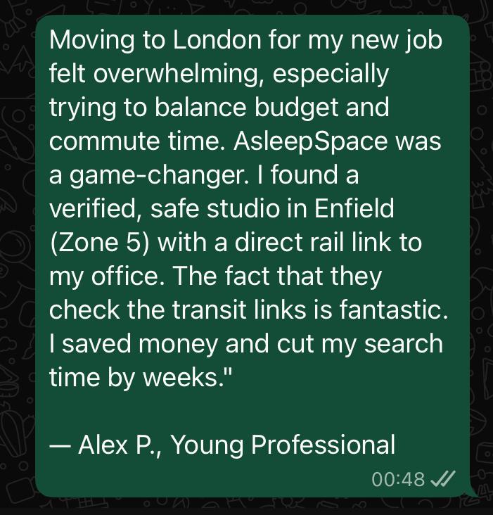 “I was dreading finding a place for my 6-month contract. AsleepSpace found me a place in Zone 3 that was clean, safe, and £300 under my monthly budget! A lifesaver.” – Sarah J., Eailing
